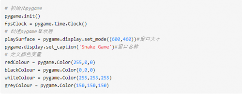 首先,我們來初始化pygame,定義顏色、游戲界面的窗口大小、標題和圖標等。
