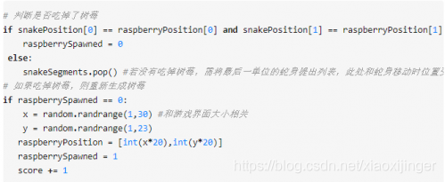 我們需要將整個界面看成許多20*20的小方塊,每個方塊代表一個單位,蛇的長度用單位來表示,同時我們采用列表的形式存儲蛇的身體。同時,我們都知道,樹莓的位置是隨機的。所以,我們需要讓樹莓出現(xiàn)的位置是游戲界面中的隨機位置,同時,每吃到一顆樹莓,就需要重新生成一顆新的樹莓,并且得分加1。相關初始化設置如下: