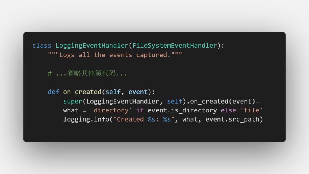 看看 LoggingEventHandler 源代碼中的 on_created ,這就是當(dāng)文件創(chuàng)建時監(jiān)控器的操作: