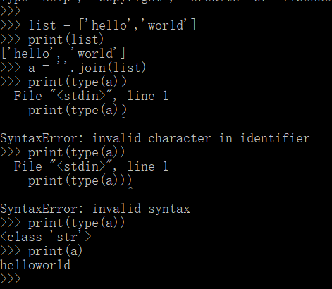 另一個需要注意的是,因?yàn)槭橇斜?,打印出來會帶著“['']”,就很煩,不是我想要的命令那種一體化的,所以在這里我又查找到了join方法,屬于列表常用方法,就是新建字符串(我特意看了下類型,下面有圖說明),讓字符串賦值:列表,并改變列表的分隔符(默認(rèn)是單引號加逗號)為join前面單引號內(nèi)的參數(shù)(可以為空None)。