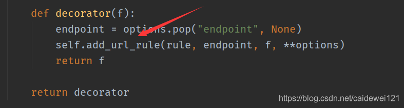 我們使用 app.route("/hello"),作為訪問(wèn)的界面,但是我們使用 ctrl + 鼠標(biāo)左鍵點(diǎn)擊 route,可以查看它的源碼,route 是作為裝飾器被使用的