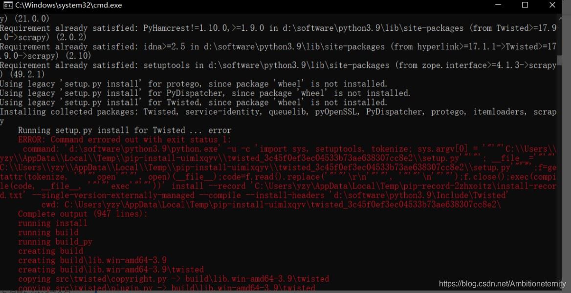 出現(xiàn)原因:我在python3.7版本里安裝沒有出現(xiàn)這樣的情況,但是在3.9版本中出現(xiàn)了這樣的錯誤。在這里scrapy會自動將一些常用的配置包給我們安裝上,但是twisted這個包安裝的時候會報錯。