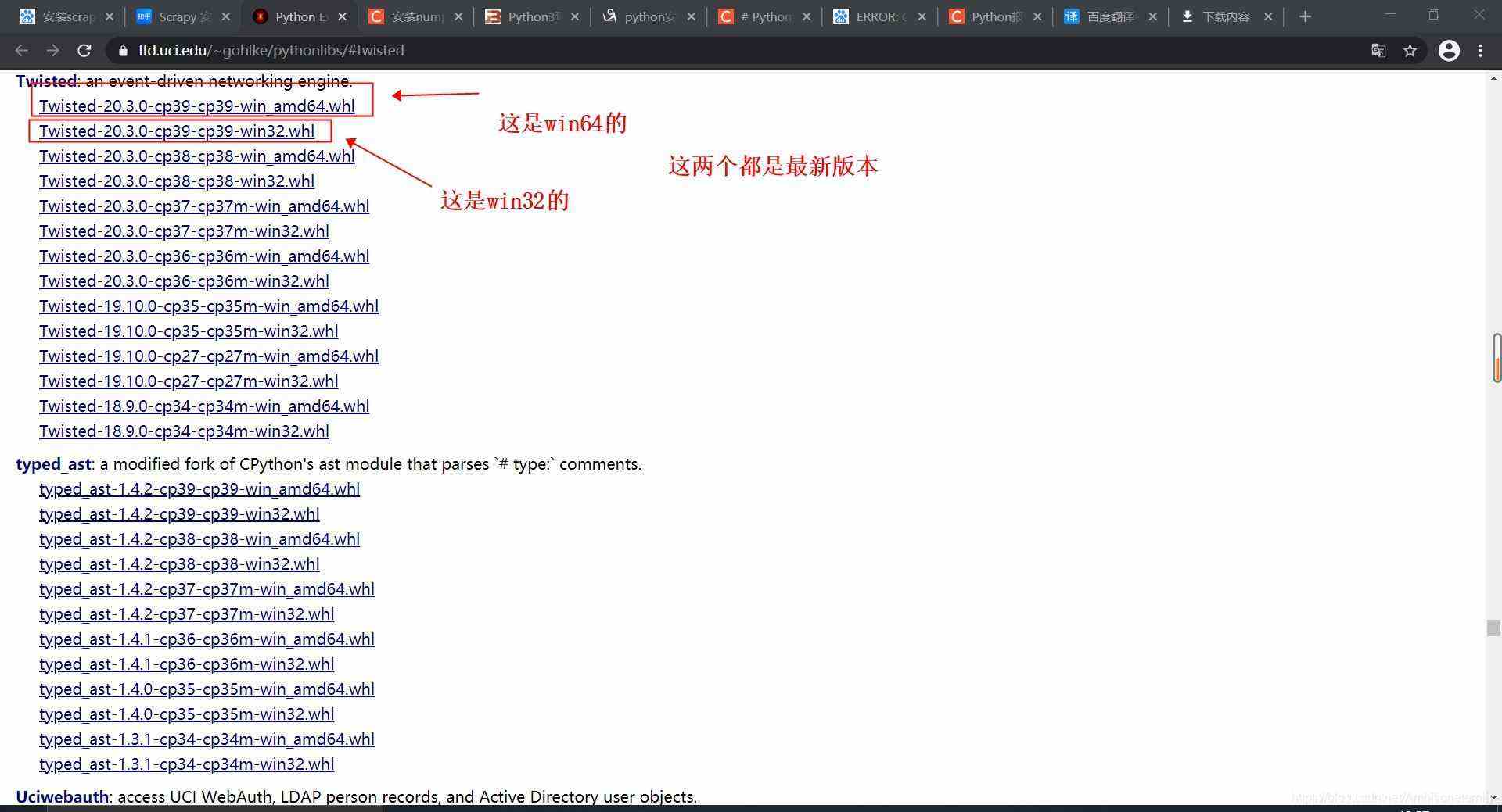 1.面對這個問題,其實我們無法通過用pip install Twisted -i https://pypi.douban.com/simple直接安裝.我們采用安裝whl(whl是文件類型)的方式來安裝twisted. https://www.lfd.uci.edu/~gohlke/pythonlibs/#twisted (這是下載鏈接,所有的第三方庫都在這個網(wǎng)頁里)