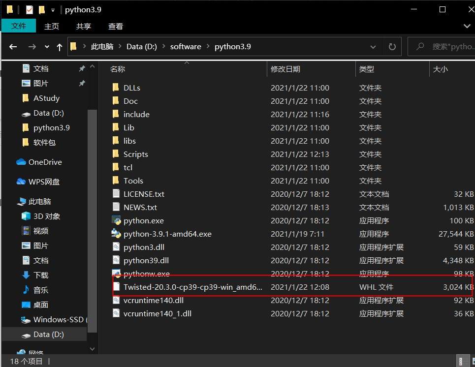 4.我把Twisted.whl放在了D:\software\python3.9里,現(xiàn)在來安裝它