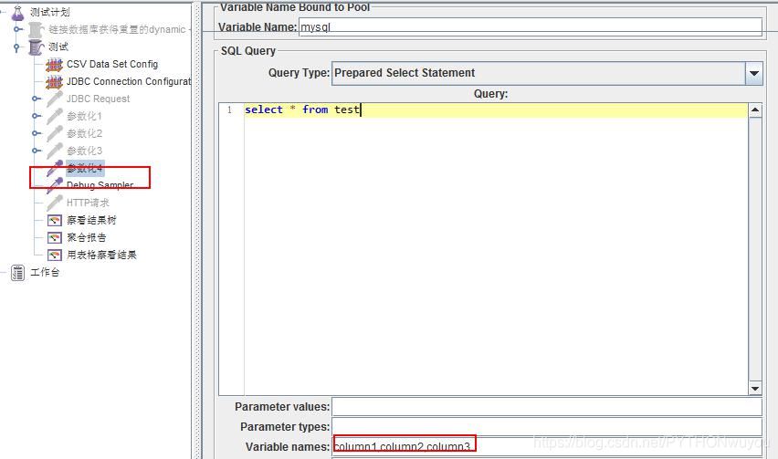 1、添加一個jdbc request名為”參數(shù)4“,添加一個”Debug Sampler“用來查看輸出的結(jié)果,設(shè)置 variables name 為 column1,column2,column3: