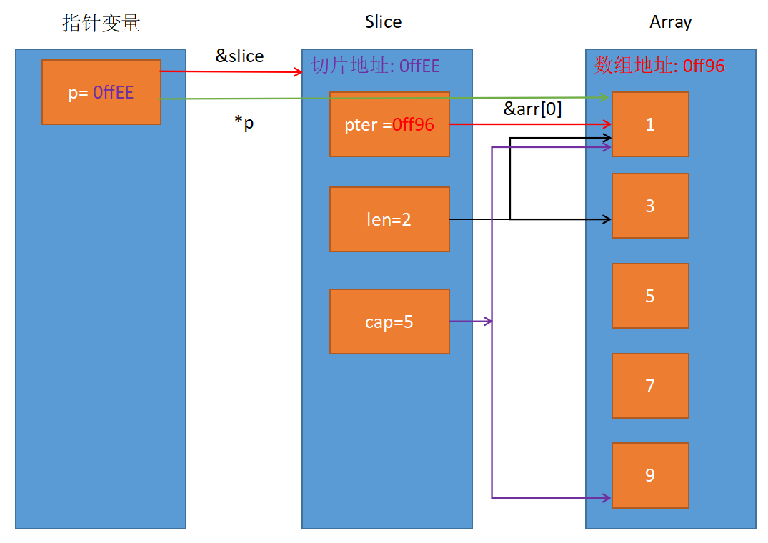 - 值得注意點(diǎn)的是切片的本質(zhì)就是一個(gè)指針指向數(shù)組, 所以指向切片的指針是一個(gè)二級(jí)指針