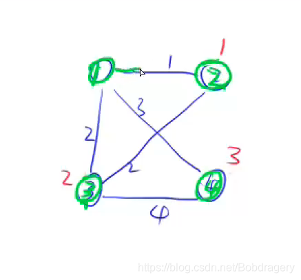 2、以第一個點為最初點,綠色表示選中,進入到最小生成樹中