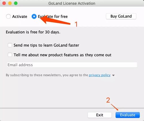如果你之前已經(jīng)使用有效期激活過(guò)可跳過(guò)此步驟,如果你是剛下載的GoLand,則需要點(diǎn)擊激活窗口的“Evaluate for free”免費(fèi)試用,然后再創(chuàng)建一個(gè)空項(xiàng)目,這樣就可以進(jìn)入到GoLand的工作頁(yè)面
