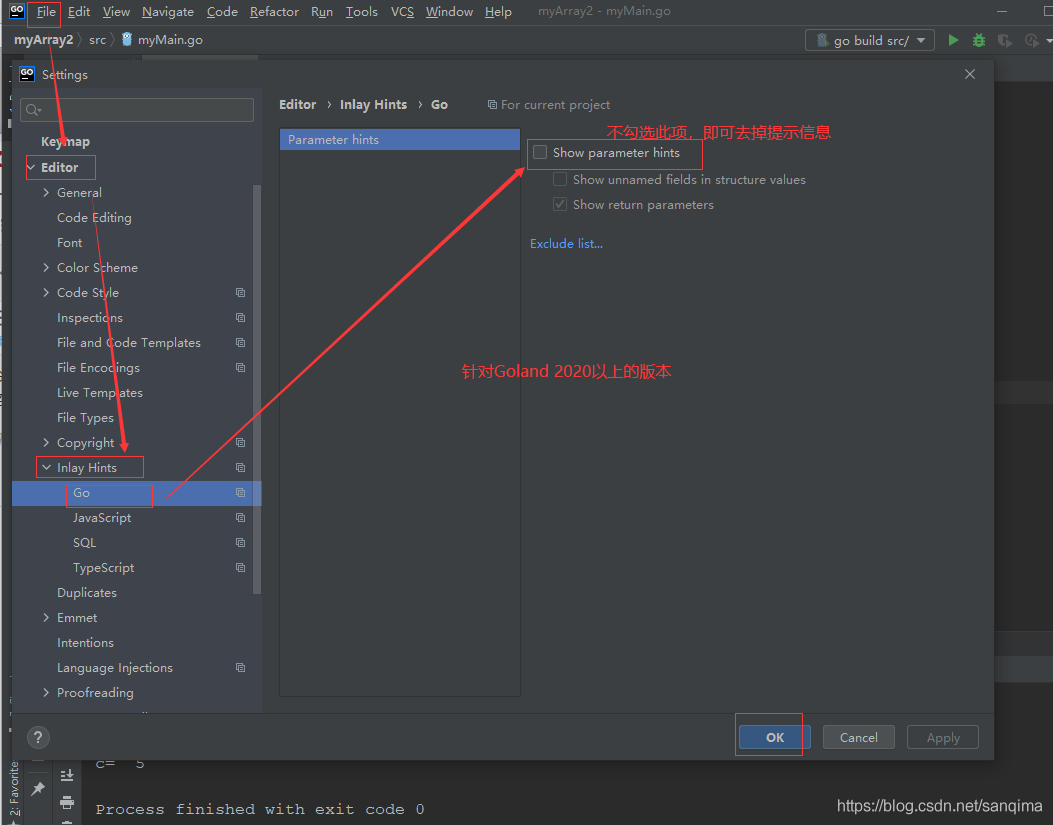 圖(1) v2020版本里,在Inlay Hints/ Go頁面,去掉 Show parameter hits前面的√