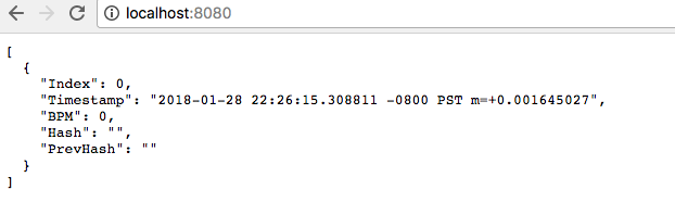 接著我們打開瀏覽器,訪問 localhost:8080 這個地址,我們可以看到頁面中展示了當(dāng)前整個區(qū)塊鏈的信息(當(dāng)然,目前只有一個創(chuàng)世塊):