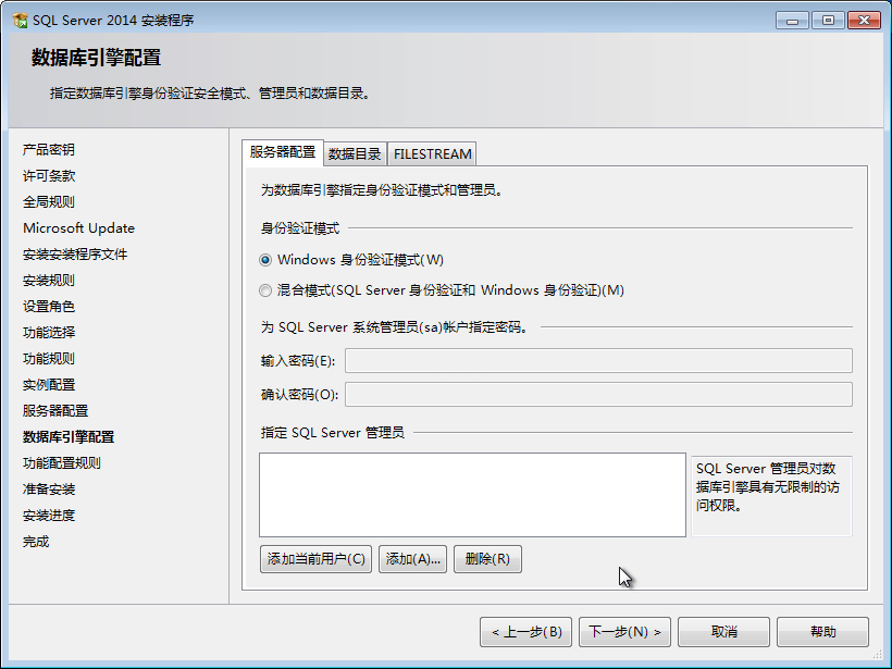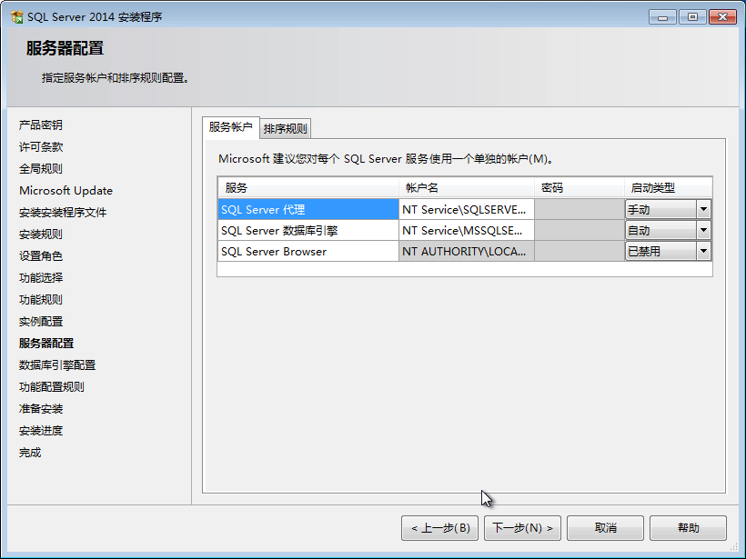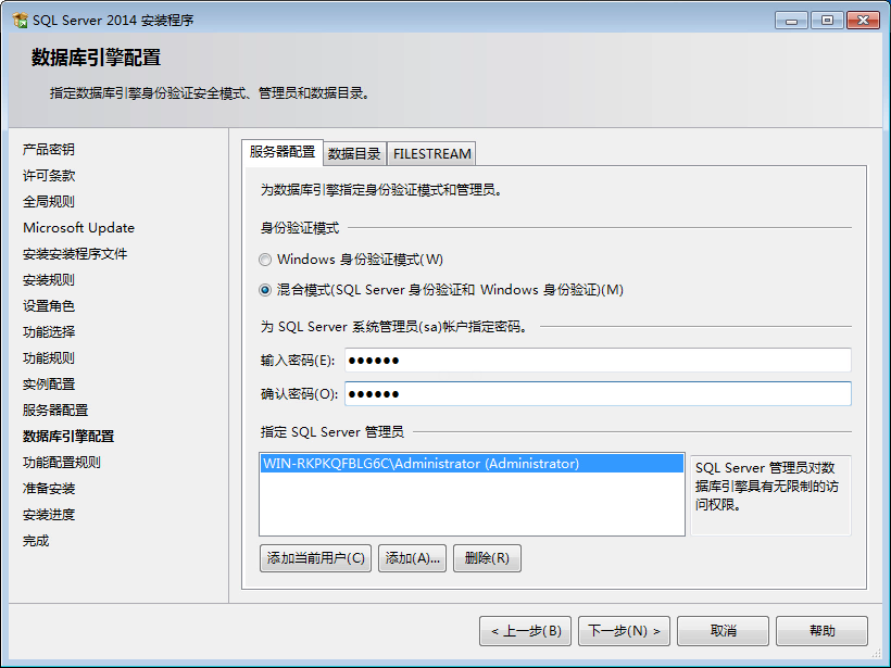 13、這里,使用默認(rèn)的賬戶配置信息。單擊“下一步”按鈕,彈出“數(shù)據(jù)庫(kù)引擎配置”對(duì)話框。