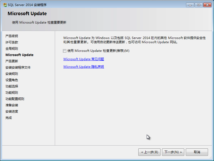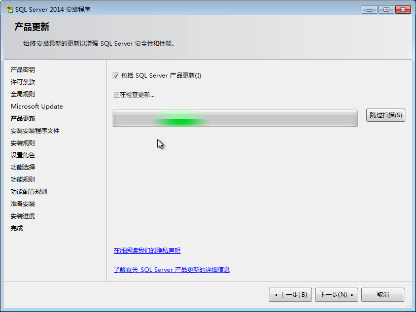 8、不勾選“包括 SQL Server 產(chǎn)品更新”選項(xiàng)。單擊“下一步”按鈕,彈出“安裝規(guī)則”對(duì)話框。
