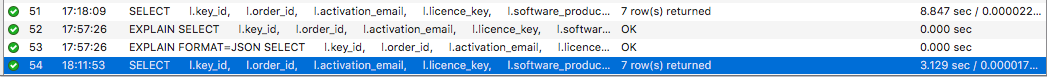 我們知道這是一個關于安全的賭注,在posts 表中software license 行是通過order_id 來跟 WooCommerce order 相關聯(lián)的,這在PHP 插件代碼中是強制的。讓我們移除join 來看看有什么提升沒有: