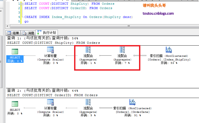 從上圖中可以看到,加了索引以后COUNT(DISTINCT ShipCity)的查詢變成了兩個(gè)流聚合,而沒有了排序,節(jié)省了開銷。