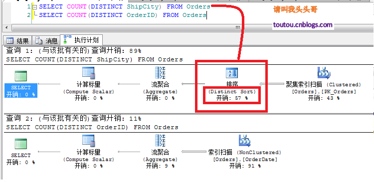 從上圖中可以看到,其實(shí)這兩個(gè)查詢從語句上來說沒什么太大的區(qū)別,但是為什么開銷會不一樣,一個(gè)是查詢城市一個(gè)是查詢訂單號。這是因?yàn)槠鋵?shí)DISTINCT對于OrderID查詢來說,是沒有什么意義的,因?yàn)镺rderID是主鍵,是不會有重復(fù)的。而ShipCity是會有重復(fù)的,Sql server的去重機(jī)制在去重的時(shí)候,會有一個(gè)排序的過程。這個(gè)排序還是比較消耗資源的。