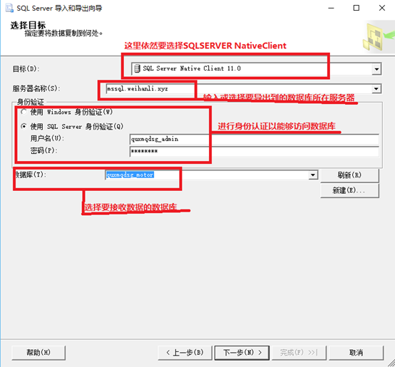 3.設(shè)置目標數(shù)據(jù)庫,導(dǎo)出到的數(shù)據(jù)庫信息