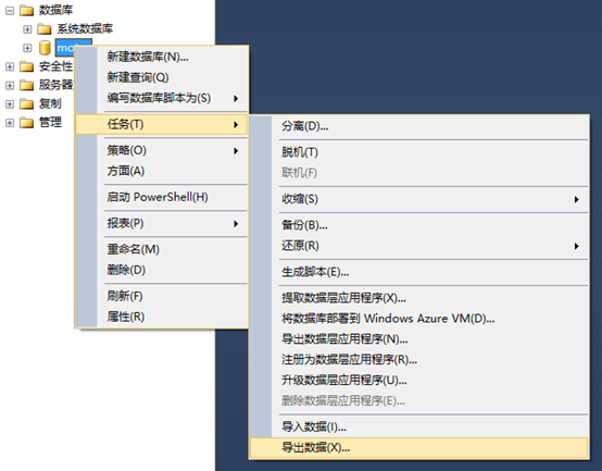 1.準備源數(shù)據(jù)庫,找到想要導(dǎo)出的數(shù)據(jù)庫,右鍵選擇"任務(wù)"再選擇"導(dǎo)出數(shù)據(jù)"