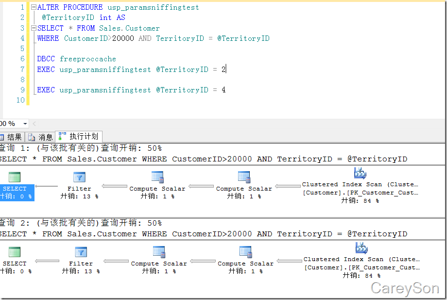 大家可能會(huì)覺(jué)得,這不是挺好的嘛,根據(jù)參數(shù)產(chǎn)生不同的執(zhí)行計(jì)劃。那讓我們?cè)倏紤]一個(gè)問(wèn)題,如果將上面的查詢(xún)放到一個(gè)存儲(chǔ)過(guò)程中,參數(shù)不能被直接嗅探到,當(dāng)?shù)谝粋€(gè)執(zhí)行計(jì)劃被緩存后,第二次執(zhí)行會(huì)復(fù)用第一次的執(zhí)行計(jì)劃!雖然免去了編譯時(shí)間,但不好的執(zhí)行計(jì)劃所消耗的成本會(huì)更高!讓我們來(lái)看這個(gè)例子,如圖4所示。