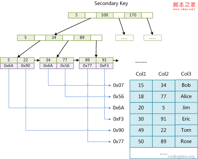 InnoDB的所有輔助索引都引用主鍵作為data域。例如,下圖為定義在Col3上的一個輔助索引: