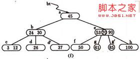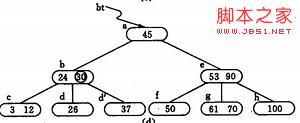 [例如],在 圖4.2(c)的B-樹中刪去關鍵字37之后,雙親b結(jié)點中剩余信息(“指針c”)應和其雙親*a結(jié)點中關鍵字45一起合并至右兄弟結(jié)點*e中,刪除后的B-樹如圖 4.2(d)所示。
