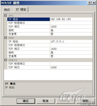 首先,最常用最常見的就是1433端口。這個(gè)是數(shù)據(jù)庫引擎的端口,如果我們要遠(yuǎn)程連接數(shù)據(jù)庫引擎,那么就需要打開該端口。這個(gè)端口是可以修改的,在“SQL Server配置管理器”中切換到“XXX的協(xié)議”里面選擇,TCP/IP協(xié)議屬性中可以設(shè)置TCP端口。如圖所示: