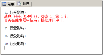 在SQL Server 2005 和 SQL Server 2008上面,可以看到如圖4.的效果。在低版本的SQL Server上,可能會出現(xiàn)錯(cuò)誤提示情況,不管如何,在觸發(fā)器外面,SQL Server都會Rollback Tran。下面我做個(gè)錯(cuò)誤提示的例子。