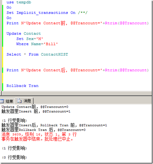 這里,你是否發(fā)現(xiàn)一個(gè)很有意思的問題,在觸發(fā)器理,執(zhí)行Insert ContactHIST之前,@@Trancount=1,執(zhí)行Insert后,@@Trancount還是為1,觸發(fā)器外面Update Contact后,@@Trancount就變成了2,。這里可以理解成,你在觸發(fā)器里面,發(fā)出一個(gè)Begin Tran,那么SQL Server 就會創(chuàng)建一個(gè)嵌套事務(wù)。當(dāng)你在觸發(fā)器里面,在Rollback Tran后面屏蔽掉Begin Tran,就會出現(xiàn)錯(cuò)誤3609,如,