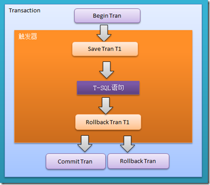 圖6.描述在觸發(fā)器中含有Save Tran savepoint_name …… Rollback Tran savepoint_name 的情況,觸發(fā)器中的Rollback Tran 只會回滾指定的保存點(diǎn),不會影響到觸發(fā)器外面的Commit Tran Or Rollback Tran操作。