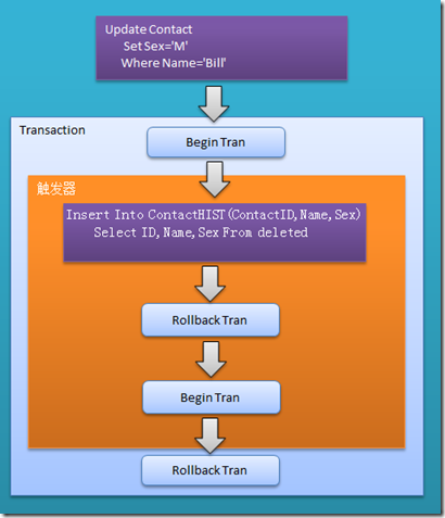 從上邊的測試情況,看出,Update Contact觸發(fā)tr_Contact觸發(fā)器操作,觸發(fā)器里面的Rollback Tran 動(dòng)作導(dǎo)致了觸發(fā)器外面的Update語句執(zhí)行回滾,而Rollback Tran 語句后面的Begin Tran語句,主要是應(yīng)用于保持整個(gè)事務(wù)的完整性。為了更能理解這一過程,我模擬了一個(gè)觸發(fā)器中的事務(wù)開始結(jié)束過程。