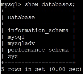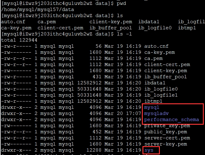 可以看到在當前有 5 個數(shù)據(jù)庫,其中 mysqladv 數(shù)據(jù)庫是我們自定義的,其余 4 個數(shù)據(jù)庫是屬于 MySQL 自帶的系統(tǒng)數(shù)據(jù)庫。我們再看一下數(shù)據(jù)目錄下的內(nèi)容: