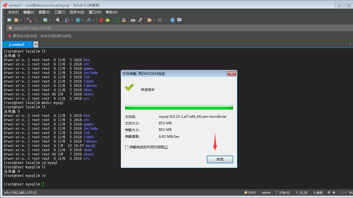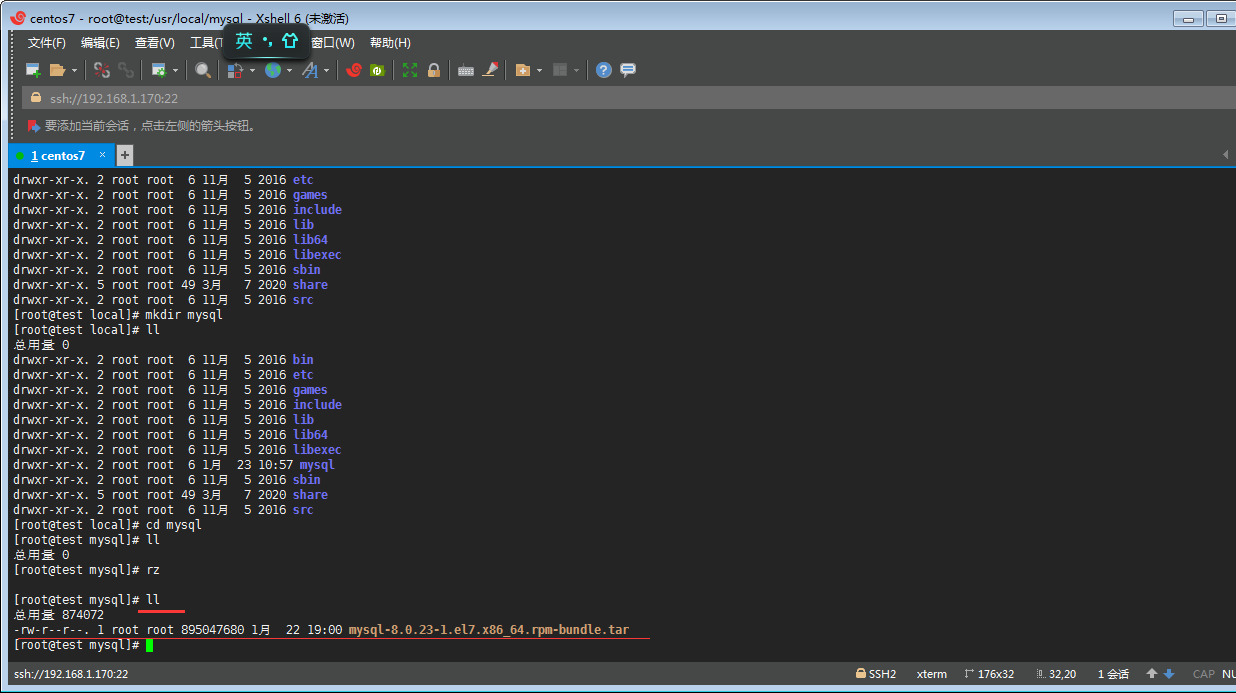 ⑧丶然后通過(guò) rz 命令上傳之前下載的mysql數(shù)據(jù)包