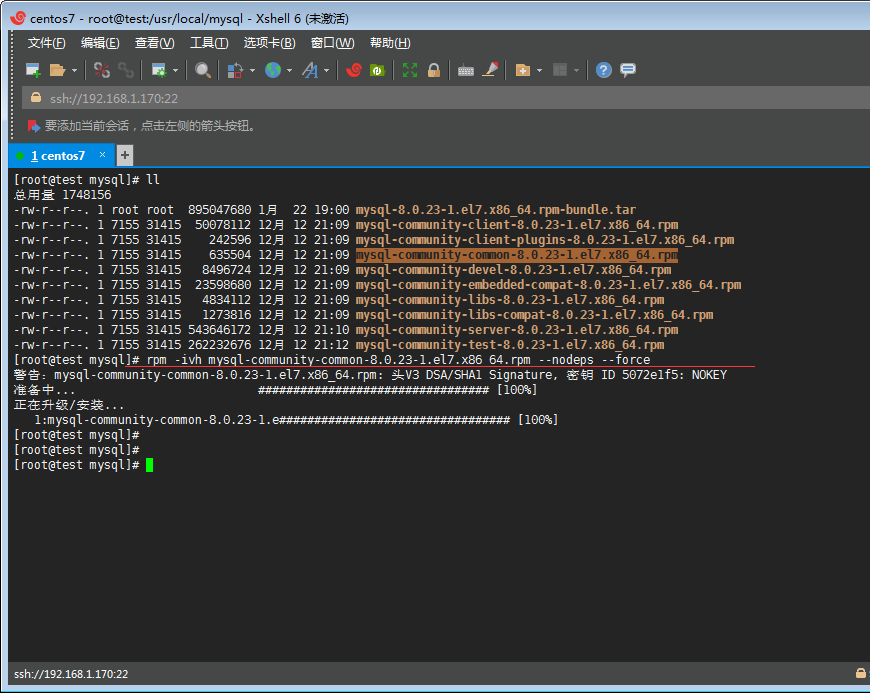 D丶通過(guò)rpm -ivh mysql-community-common-8.0.11-1.el7.x86_64.rpm --nodeps --force 命令安裝common
