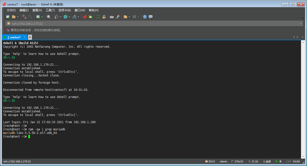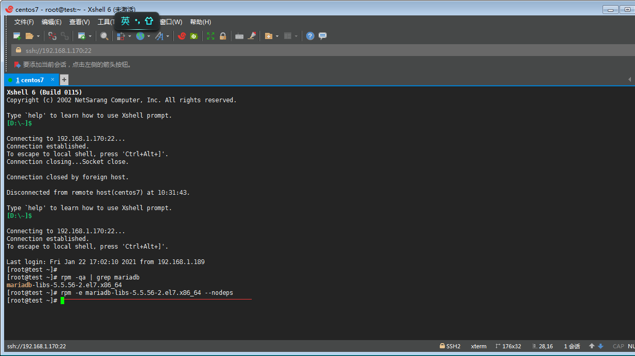 ②丶再通過(guò)命令 rpm -e mariadb-libs-5.5.56-2.el7.x86_64 --nodeps 卸載mariadb