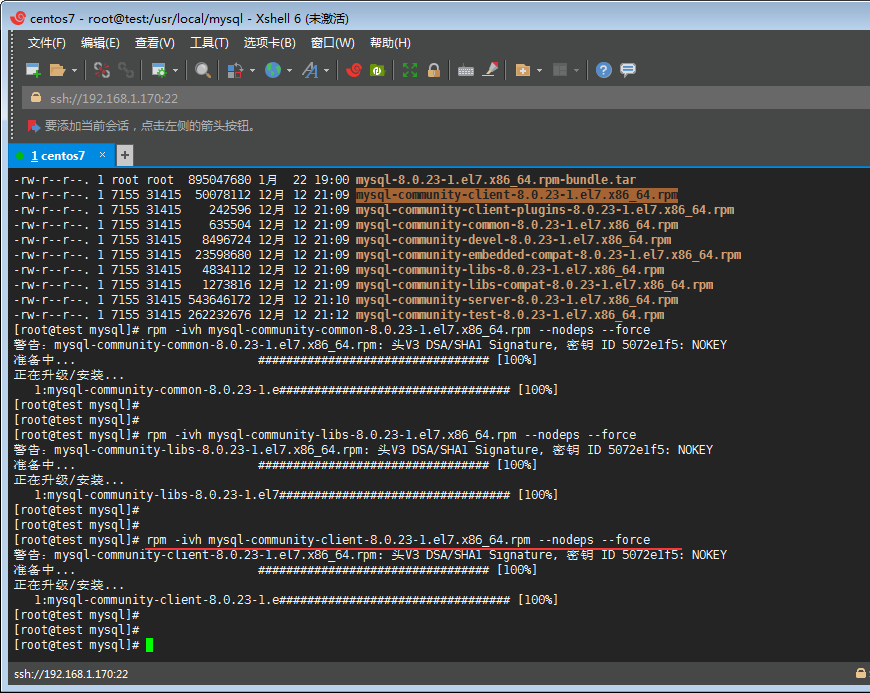 F丶.通過(guò)rpm -ivh mysql-community-client-8.0.11-1.el7.x86_64.rpm --nodeps --force命令安裝client