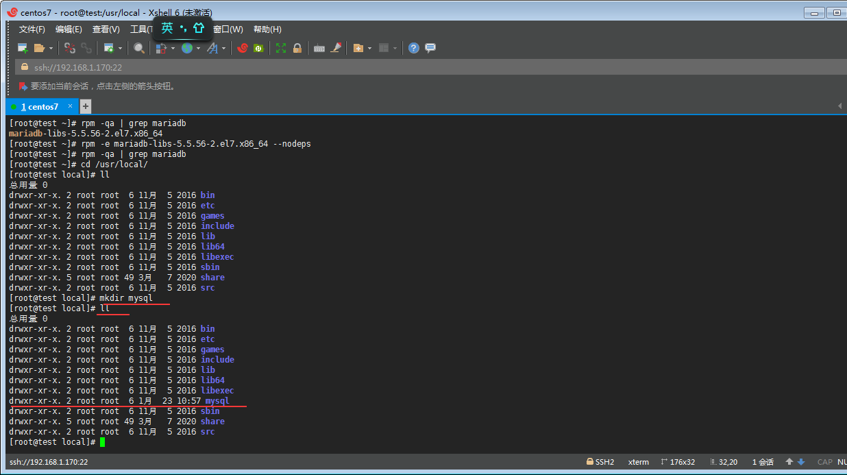 ⑥丶通過(guò)mkdir mysql 命令 在當(dāng)前目錄下創(chuàng)建一個(gè)名為 mysql 的目錄,并且ll查看一下新建的mysql目錄