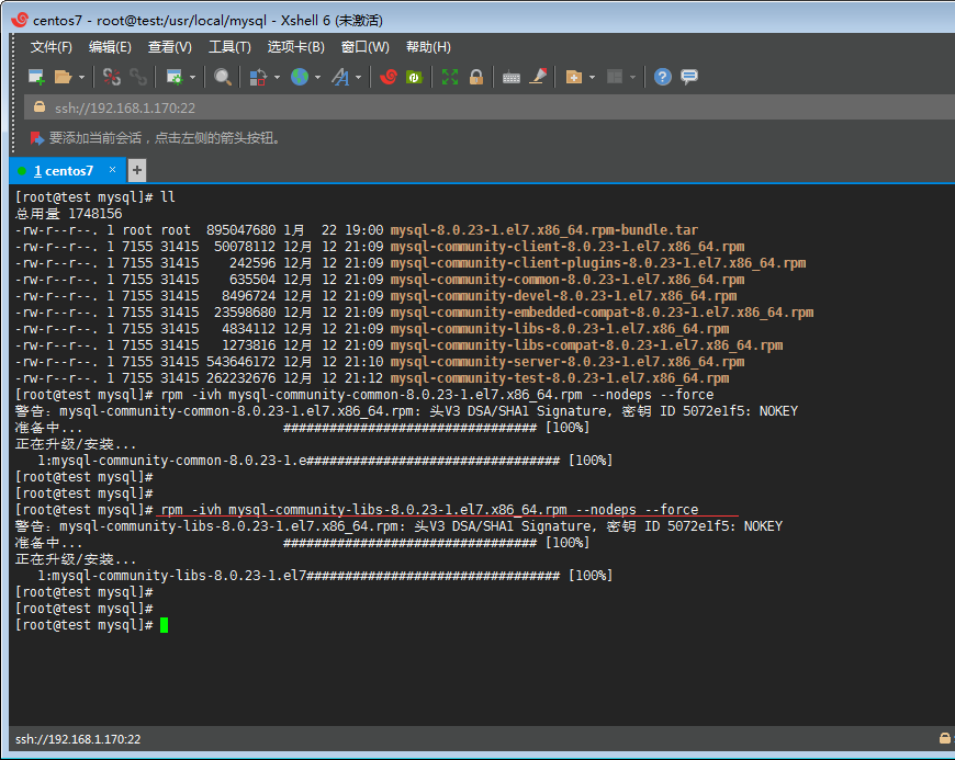 E 丶通過(guò)rpm -ivh mysql-community-libs-8.0.11-1.el7.x86_64.rpm --nodeps --force命令安裝libs