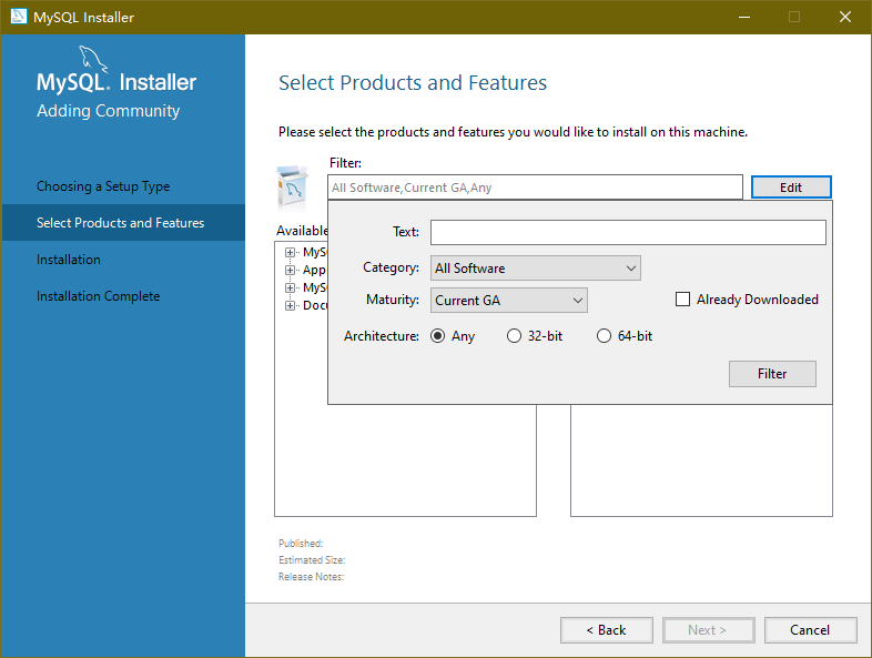 點擊“Filter”框右側(cè)“Edit”按鈕進(jìn)行安裝選擇項的篩選,在STEP2如果已經(jīng)復(fù)制文件的話,勾選“Already Downloaded”,否則視自己本機操作系統(tǒng)選擇32位或者64位來進(jìn)行篩選。