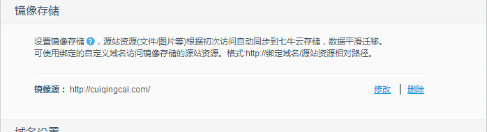 下面還有一個(gè)域名設(shè)置,它默認(rèn)會(huì)為你分配一個(gè)默認(rèn)永久的空間,比如我的就是 cuiqingcai.qiniudn.com,這個(gè)是七牛的二級(jí)域名,七牛的一大特色就是支持域名綁定,在這里你可以添加你的二級(jí)域名,不過(guò)貌似需要你賬戶(hù)余額大于10塊,但是它是不收費(fèi)的。另外的要求就是你的域名需要備案,如果沒(méi)有備案,那就不行了。