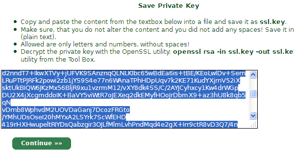 使用Tool Box - Decrypt Private Key,將前面生成的ssl.key的內(nèi)容解密。將結(jié)果保存為.key文件。比如ssl2.key。