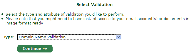 選擇Domain name validation,點(diǎn)擊Continue。