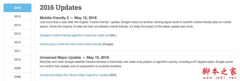 利用Moz的一個(gè)工具(Moz’s Algorithm Change History),在這里可以查看網(wǎng)站從2000年到現(xiàn)在的主要的一些變化,并且經(jīng)常更新,對(duì)我來(lái)說(shuō)這個(gè)功能非常的重要。這個(gè)頁(yè)面列出的網(wǎng)站更新情況還可以讓我發(fā)現(xiàn)一些工作中我的一些改動(dòng)所帶來(lái)的其他影響。因此我會(huì)經(jīng)常到這里查看是否有一些新的動(dòng)態(tài)信息。