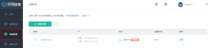 容器管理入口位于網(wǎng)易蜂巢首頁的容器管理選項,點擊「容器管理」,顯示當(dāng)前用戶的所有容器列表。