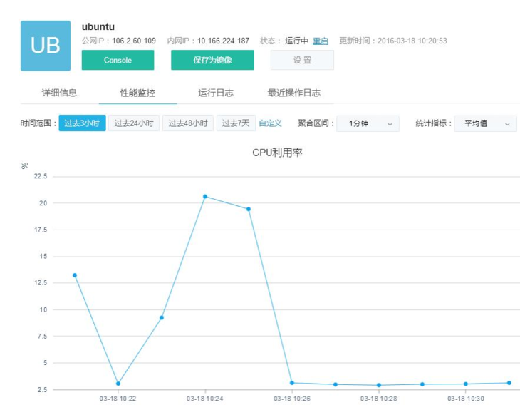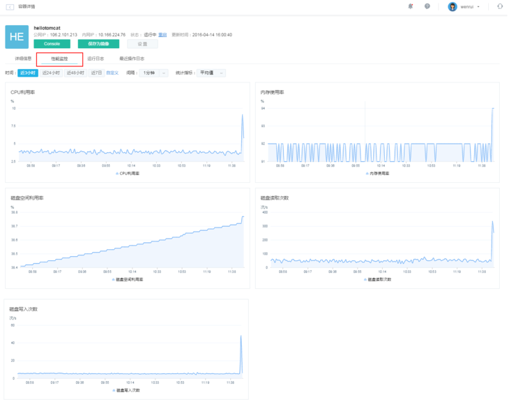在容器詳情頁面,點擊「性能監(jiān)控」標(biāo)簽,展示了相應(yīng)容器的性能監(jiān)控詳情。性能監(jiān)控主要針對 CPU 利用率、內(nèi)存利用率、磁盤空間利用率、磁盤讀寫次數(shù)進(jìn)行監(jiān)控,實時顯示當(dāng)前容器的 CPU 利用率及內(nèi)存使用大小,如下圖所示。