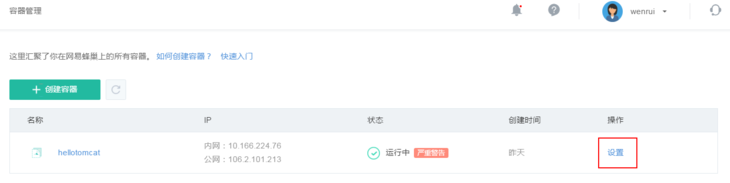 創(chuàng)建成功后,可對容器進(jìn)行設(shè)置。在容器列表中點擊相應(yīng)的「設(shè)置」按鈕,可設(shè)置的內(nèi)容有:容器描述和環(huán)境變量。