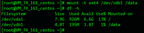 使用命令“mkdir /mydata”創(chuàng)建mydata目錄,再通過“mount /dev/vdb1 /mydata”命令手動掛載新分區(qū)后,用“df -h”命令查看,出現(xiàn)以下信息說明掛載成功,即可以查看到數(shù)據(jù)盤了。