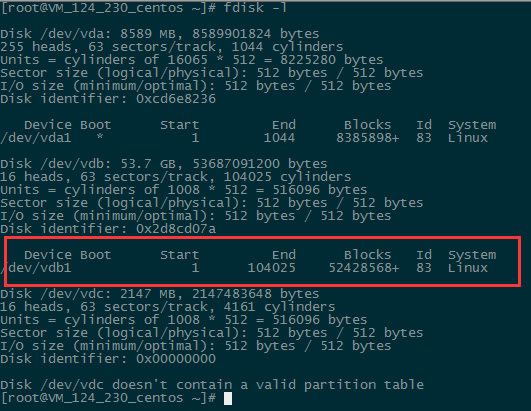 使用“fdisk -l”命令,即可查看到,新的分區(qū)vdb1已經(jīng)創(chuàng)建完成。