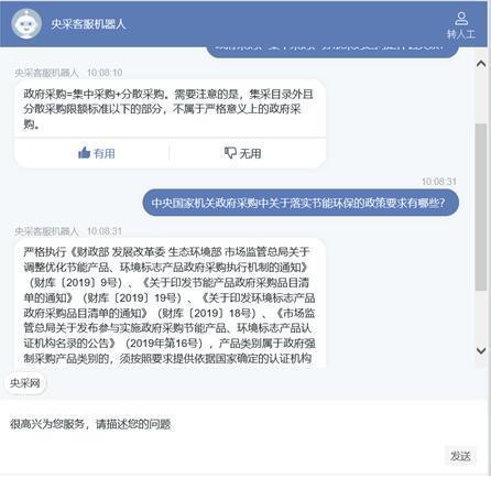 國采中心在中央政府采購網(wǎng)網(wǎng)頁和微信公眾號開通智能客服渠道,讓用戶在線辦理業(yè)務(wù)時能更方便地發(fā)起咨詢;采購人、供應(yīng)商、訪客等用戶,可點擊中央政府采購網(wǎng)“智能客服”圖標(biāo),或在國采中心微信公眾號點擊“國采服務(wù)——智能客服”,直接咨詢各類問題,匹配對應(yīng)處室,提高了服務(wù)效率,提升了用戶體驗。