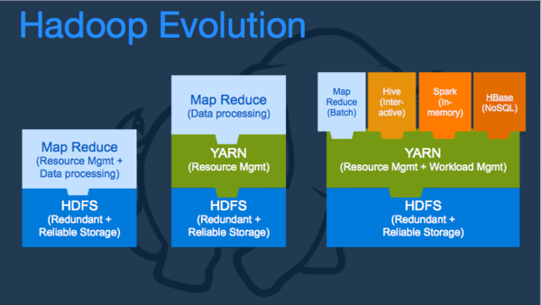 基礎(chǔ)架構(gòu)的創(chuàng)新主導(dǎo)了Hadoop 的進(jìn)化,從最初的基于HDFS和MapReduce的批處理應(yīng)用不斷演變,第一代的Hadoop提供了靈活和可擴(kuò)展的數(shù)據(jù)結(jié)構(gòu)和處理能力,并在大數(shù)據(jù)興起之時(shí)滿足了公司各種大小數(shù)據(jù)處理需求提供了民主化需求。然而畢竟其只是第一步,有著各種限制,如果將其對比于操作系統(tǒng)的話, 第一代Hadoop就如操作系統(tǒng)和應(yīng)用,例如記事本捆綁在一起,且僅有一個(gè)應(yīng)用,即MapReduce。然而隨之而來的大量任務(wù)導(dǎo)致了調(diào)度瓶頸,從而促成了YARN(Yet Another Resource Negotiator)項(xiàng)目的成立和發(fā)展,其解決了JobTracker在超大規(guī)模集中成為瓶頸等問題,并支持各種應(yīng)用通過YARN來進(jìn)行資源調(diào)度和管理從而將Hadoop帶入了下一個(gè)時(shí)代,