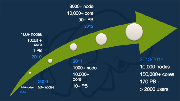 2010年,eBay 上線了基于CDH2的集群,擁有532個(gè)節(jié)點(diǎn),超過5PB的存儲(chǔ)容量,并于2012年上線了基于HDP的集群,超過3000個(gè)節(jié)點(diǎn),容量超過50PB。2014年,總節(jié)點(diǎn)數(shù)據(jù)超過10000多個(gè),存儲(chǔ)容量超過170PB,活躍用戶超過2000多,現(xiàn)在,相關(guān)規(guī)模還在不斷增長中。隨之帶來的管理、監(jiān)控、分析和存儲(chǔ)的挑戰(zhàn)越來越嚴(yán)峻。