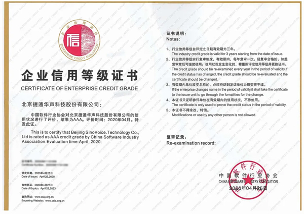 捷通華聲作為國(guó)內(nèi)領(lǐng)先的人工智能技術(shù)、產(chǎn)品與服務(wù)提供商,積極響應(yīng)國(guó)家號(hào)召,從技術(shù)升級(jí)、產(chǎn)業(yè)落地、服務(wù)保障等多方面支持新基建。日前,捷通華聲服務(wù)產(chǎn)業(yè)能力再獲認(rèn)可,在2020年(4月)中國(guó)軟件和信息服務(wù)業(yè)企業(yè)信用評(píng)價(jià)結(jié)果公示中,獲最高級(jí)別信用評(píng)價(jià)“AAA”。